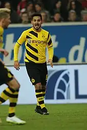 On 5 May 2011, Gündoğan signed a four-year contract with another Bundesliga club, Borussia Dortmund.[6] He made his debut on 23 July in the 2011 DFL-Supercup against Schalke. After a 0–0 draw at Arena AufSchalke, he scored Dortmund's first attempt in the penalty shoot-out, which they went on to lose 4–3.[8] On 17 December, he scored his first goal for Dortmund in a 4–1 victory away to SC Freiburg.[9] He played once for the club's reserves on 22 February 2012, being replaced at half time by Rico Benatelli in an eventual 2–1 win over 1. FC Kaiserslautern II at the Stadion Rote Erde.[10] On 20 March, Gündoğan scored a 120th-minute goal which saw Dortmund defeat Greuther Fürth and progress to the 2012 DFB-Pokal final.[11] He played the entire final on 12 May, a 5–2 victory over Bayern Munich that gave Dortmund their first domestic double.[12]