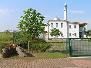 | 8. | Aziz Mosque | Riedstadt | Hesse | 2004 | "Mosque of the all-powerful“, foundation Nov 2003, completed Aug 2004, plot 1753 m2, prayer hall 200 m2, one minaret 14 m height[8] 49°49′54.9″N 8°29′6.4″E / 49.831917°N 8.485111°E[M 10] | ![]() |