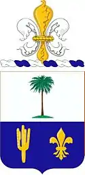 A Gold color metal and enamel device 1 1/8 inches (2.86 cm) in height overall consisting of a shield blazoned: Per fess Argent and Azure, in chief a palm tree on a mount Proper and in base a giant cactus and fleur-de-lis Or. Attached below the shield is a Blue scroll doubled and inscribed "MEN, DO YOUR DUTY" in Gold letters.
