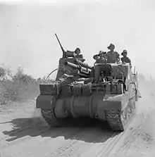 On 1 September 1944, 36th Indian Division was redesignated as a British division, the majority of the Indian Army units having been transferred.[11][14][18][24] The gunners of the rest of 178th Assault Fd Rgt were flown into Burma to join the division on 15 October (321 A/T Bty having returned unused to Shillong in September).[11][20] When NCAC began its post-Monsoon offensive on 16 October 1944, 36th Division was the only formation in contact with the enemy, and was the first to run into heavy opposition on 25 October, at a Japanese defensive position that blocked all roads. This was broken through on 29 October and Mawlu occupied on 31 October, but then the Japanese began to raid the division's precarious supply route and the advance halted until the following Chinese division broke through to Mawlu. Resuming its advance along the railway corridor, 36th Division captured Pinwe on 30 November, and occupied Indaw, Naba and Katha, reaching the Irrawaddy and Shweli Rivers without opposition during December. It continued to push along the river valleys in January 1945, meeting occasional rearguards, until it found the river crossing on the Shweli bend at Myitson to be strongly held.[25][26]