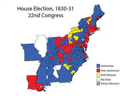 The brash style of Congress during the administration of Jackson caused a number of Americans to become dissatisfied with the government and both of the major parties. Anger over the Tariff of 1828 also provided a major issue, particularly in the agricultural South. The Jacksonians remained firmly in control of the House, but lost several seats, as did the minority National Republicans. The Anti-Masonic Party, an aspiring third party which was based on a single issue (distrust of Freemasonry), was actually able to gain a dozen seats, and four South Carolina Congressman who called themselves Nullifiers (based on the principle of states' rights) were also elected. Thus, this was the first election in the House where both major parties lost seats at the same time; this would not occur again until the 1854 elections.