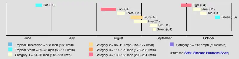 - ↑ Broadly speaking, ACE is a measure of the power of a tropical or subtropical storm multiplied by the length of time it existed. Therefore, a storm with a longer duration or stronger intensity, such as Hurricane Two, will have high values of ACE. It is only calculated for full advisories on specific tropical systems reaching or exceeding wind speeds of 39 mph (63 km/h). Accordingly, tropical depressions are not included here.