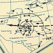 The hurricane began as a tropical wave—a westbound low-pressure area—first observed southeast of Cape Verde on 29 August.[1] Traversing the tropical Atlantic, the wave retained a minimum barometric pressure of about 1010 mbar (hPa; 29.83 inHg) and strengthened briefly the following day.[2][3] By 1 September, however, the wave had become rather weak and indiscernible; it would remain as such for much of its early existence until 6 September, by which time it had moved past the Windward Islands. In this region the system became sufficiently organised to be classified as a tropical depression at 18:00 UTC that same day near Grenada.[4][5] Some six hours after its inception the depression strengthened to a tropical storm over the eastern Caribbean Sea. Owing to a lack of ship observations, data on the storm were scarce in that region. The first ship to identify the storm clearly was the tanker Geo H. Jones, which recorded strong winds in conjunction with rapidly decreasing barometric pressures late on 7 September.[4] As the storm remained west-northwest bound across the Caribbean,[5] more ships were able to record data on the cyclone.[2]