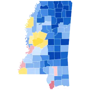 No Democratic presidential nominee has carried the following counties since Stevenson did so in this election: Lamar, Lauderdale, Lincoln, Lowndes, Newton, Rankin, Scott and Simpson.[17] Stevenson is also the last Democrat to carry Clarke County outright, but Jimmy Carter and Ronald Reagan tied there with 3,303 votes apiece in 1980.[20] Oktibbeha County would not vote Democratic again until Barack Obama carried it in 2008. This is also the last election in which the Democratic nominee carried Mississippi without winning the presidency or that a Republican won two terms without ever winning the state.