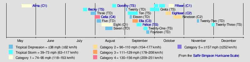 Tropical cyclogenesis began in May, with Alma developing on May 17. No tropical cyclone activity occurred in June. Three systems originated in July, including Tropical Storm Becky and the depression that would eventually intensify into Hurricane Celia, as well as another tropical depression that remained below tropical storm intensity. Celia became the most intense tropical cyclone of the season on August 3, peaking as a Category 3 hurricane on the Saffir–Simpson scale with maximum sustained winds of 140 mph (220 km/h) and a minimum barometric pressure of 944 mbar (27.88 inHg).[3] In August, four tropical systems developed, including two tropical depressions, an unnamed hurricane, and Dorothy. September eight featured tropical depressions, though only three became named storms – Ella, Felice, and Greta.[6] October featured two unnamed hurricanes. Two more systems, a tropical depression and an unnamed tropical storm, developed in November, the latter of which transitioned into an extratropical cyclone on December 1, ending the season's activity.[3]