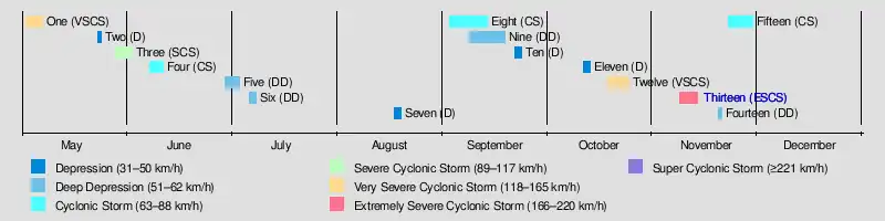 | Thirteen | November 8–13, 1970 | Extremely Severe Cyclonic Storm | 185 km/h (115 mph) | 966 hPa (28.53 inHg) | India, Bangladesh | 300,000–500,000 | [2] | |