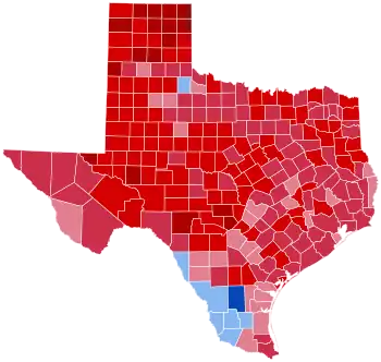 McGovern's only county wins came from the south Texas region along the U.S.-Mexico border and Cottle County in the northern part of the state, though even his performances here were underwhelming. In fact, in the oldest extant Democratic stronghold in the entire United States,[3] Nixon became the only Republican since Dwight D. Eisenhower in 1952 to win Dimmit County and Presidio County, and the only Republican apart from Eisenhower's two victories there to win Hidalgo County and Wilacy County since it was created in 1921. This is also the last election at which Zavala County has voted Republican,[3] though that county did so even in 1960. Duval County, however, gave McGovern over 85 percent of the vote, which was the highest percentage of votes he received in any county nationally.[4] 1972 was the third successive election when Duval proved the most Democratic county in the nation. He was the first Republican to ever carry La Salle, Hidalgo, Jim Wells, Wilacy, Brooks, Cameron, Kenedy, and Nueces counties (all in South Texas), and the first since 1920 to carry Zavala County; and the first since 1928 to carry Dimmit, Frio, Kleberg, and San Patricio counties. He was the first Republican to carry many historically Democratic East Texas counties as well.