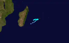 While Bemezava was still active, another circulation was present between Réunion and Madagascar on February 8. On the next day, a tropical disturbance formed about 150 km (95 mi) east-southeast of Toamasina, Madagascar. A ridge to the south caused the nascent system to move erratic, although generally to the southeast and east. It intensified into Tropical Storm Clotilda on February 10,[16][17] and on the next day that the JTWC classified it as Tropical Cyclone 17S.[2] The storm slowed and approached within 50 km (30 mi) of Réunion before stalling. It moved slowly near the island for two days, during which it remained about 30 km (18 mi) off the northern coast. On February 13, Clotilda attained peak 10 minute winds of 110 km/h (70 mph). A weak ridge steered the storm back to the southwest, and on February 14, Clotilda struck northern Réunion at Sainte-Suzanne. The ridge moved to the east, causing the storm to accelerate and gradually weaken. On February 17, Clotilda became extratropical while turning southeastward due to an approaching trough. The remnants persisted several days until dissipating on February 22 near Île Amsterdam.[16][17]