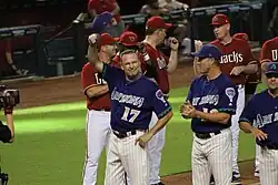 Mark Grace (waving cap) and Matt Williams (farthest right in the red jersey), among others, during the Diamondbacks alumni game in 2018.