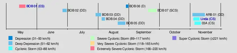 The 1997 North Indian Ocean cyclone season had no bounds, but cyclones tend to form between April and December, with peaks in May and November. These dates conventionally delimit the period of each year when most tropical cyclones form in the northern Indian Ocean.