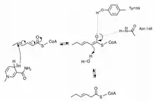 Crystallization[7] of DECR with 2,4 Hexadienoyl-CoA and NADPH (not shown). Key residues in the enzyme active site orient the substrate for hydride transfer through a network of hydrogen bonds.