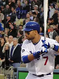 The 2002 Los Angeles Dodgers season was the 113rd for the franchise in Major League Baseball, and their 45th season in Los Angeles, California. The season saw Dan Evans take over as General Manager and in his first season the team won 92 games and was not eliminated from post season contention until the next-to-last day of the season, finishing third overall in the National League West. Shawn Green hit 42 home runs to become the first Dodger to have back-to-back 40 or more homer seasons. He had four homers in one game on May 23 against the Milwaukee Brewers. He went 6-for-6 in that game and set a Major League mark for total bases with 19.[1] The number broke the previous record of 18 total bases set by Joe Adcock. Éric Gagné, a former starter, was turned into the closer and proceeded to set a club record for saves with 52. This is also their first season to be broadcast on KCOP (13).
