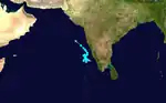 A tropical disturbance was observed on November 19 about 800 km (500 mi) southeast of Colombo, Sri Lanka in the Bay of Bengal.[26] The disturbance tracked westward, weakening after passing south of Sri Lanka.[25] It entered the Arabian Sea on November 26, and despite being located unusually close to the equator, the system maintained convection about its circulation, aided by low wind shear.[25] While the system was organizing, the center crossed the equator to reach about 0.5° S, thus becoming an anticyclonic circulation in the southern hemisphere. This was unusual, as the Coriolis effect is nonexistent along the equator—the Coriolis effect refers to planetary vorticity, which provides the spin in a cyclone.[26][27] On November 28, the JTWC classified it as Tropical Cyclone 05A just 78 km (48 mi) from the equator.[25] The IMD classified it as a depression the next day at 1.5° N, noting that "cyclogenesis ... at such low latitudes has not occurred in the past."[1] It rivaled Tropical Storm Vamei as one of the closest storms to the equator.[25]