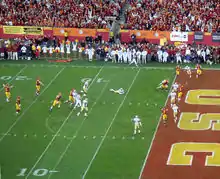 UCLA was without its two starting quarterbacks. UCLA starter Ben Olson went out with a knee injury late in the first quarter, which left freshman walkon redshirt McLeod Bethel-Thompson to lead the Bruins.[6] This was the first appearance for the Irish in the Rose Bowl stadium since the 1925 Rose Bowl. The Irish were able to capitalize on Bruin offensive mistakes to recover loose balls. This ended one of the worst slumps in Fighting Irish football, and prevented the Irish from equaling their longest losing streak in their history.[7] In the 1960 NCAA University Division football season, the Irish lost eight straight games.[8] The biggest cheer during the entire game came when the score of the 2007 Stanford vs. Southern California football game was announced. Fighting Irish and Bruins fans, who together are arch-rivals of the Trojans, cheered together.[9]