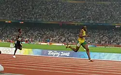 The Olympic records for the distance are 19.30 seconds for men, set by Usain Bolt in 2008, and 21.34 seconds set by Florence Griffith-Joyner in 1988. The men's world record was set at the Olympics in 1956, 1960 (twice), 1968, 1996 and 2008.[1] The women's world record has similarly been linked to the competition, with records coming at the Olympic Games in 1952 (twice), 1956, 1968, 1972 and 1988 (twice). Griffith-Joyner's 1988 Olympic mark remains the world record for the distance, while Bolt's Olympic record is the third fastest of all-time.[2]