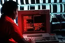 The 3279 was introduced in 1979.[18] The 3279 was widely used as an IBM mainframe terminal before PCs became commonly used for the purpose. It was part of the 3270 series, using the 3270 data stream.[19] Terminals could be connected to a 3274 controller, either channel connected to an IBM mainframe or linked via an SDLC (Synchronous Data Link Control) link. In the Systems Network Architecture (SNA) protocol these terminals were logical unit type 2 (LU2). The basic models 2A and 3A used red, green for input fields, and blue and white for output fields. However, the models 2B and 3B supported seven colors, and when equipped with the optional Programmed Symbol Set feature had a loadable character set that could be used to show graphics.