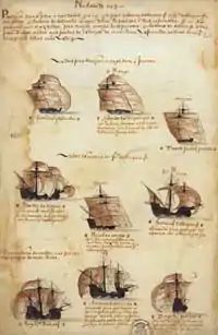 [Almost all Portuguese chronicles suggest that the first squadron was composed only of three ships. However, the account of Italian passenger Giovanni da Empoli, the only eyewitness account of this armada, claims there were four and gives their names and tonnages as listed above.[1] The list of captains is principally based on João de Barros's Décadas,[2] Damião de Gois's Chronica,[3] Castanheda's História,[4] Faria e Sousa's Asia[5] and Quintella's Annaes da Marinha.[6] The Relação das Naus da Índia swaps around Fernão Martins de Almada and Pedro Vaz da Veiga[7] The chronicle of Gaspar Correia places nephew Vicente Albuquerque (son of Francisco?) in command of one of the naus of the first squadron, shunting Almada to the second squadron, in place of Vaz da Veiga (who is omitted).[8]]