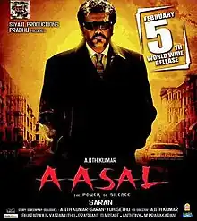 Aasal (ⓘ) (transl. Original) is a 2010 Indian Tamil-language action thriller film directed by Saran. The film stars Ajith Kumar in the lead role, who is also co-wrote the film's script, while Sameera Reddy and Bhavana play the lead female roles. The film has an ensemble cast, with Prabhu, Pradeep Rawat, Sampath Raj and Rajiv Krishna playing prominent roles, among others. The film, produced by Prabhu of Sivaji Productions, features music primarily composed by Bharadwaj, cinematography by Prashanth D. Misale and editing by Anthony Gonsalves.