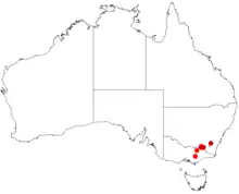 Its distribution is limited to a small area on the border between south-eastern New South Wales and north-eastern Victoria.[6] In New South Wales it is found along the southern edge of Woomargama National Park and has an estimated population of 2000 plants. In Victoria it is found in the Burrowa-Pine Mountain National Park from two stands east of the summit of Pine Mountain with nine plants in one stand and between 150 and 250 in the other. The Victorian populations are located approximately 35 km (22 mi) from the New South Wales populations.[1]