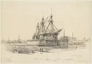 ![]() Amsterdam Wooden Drydock II with ship De Javaan, on 28 June 1859 by Johan Conrad Greive | |