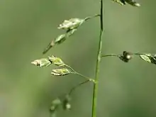 The panicle is open and triangular shaped, 5 to 7.5 cm (2 to 3 in.) long. The spikelets are stalked, awnless, 1 to 2 cm (3/8 to 3/4 in.) long when flowering, and loosely arranged on delicate paired or spreading branches. Sometimes they are tinged purple.