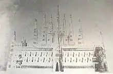 During his studies, Gaudí designed various projects, among which the following stand out: a cemetery gate (1875), a Spanish pavilion for the Philadelphia World Fair of 1876, a quay-side building (1876), a courtyard for the Diputació de Barcelona (1876), a monumental fountain for the Plaça Catalunya in Barcelona (1877) and a university assembly hall (1877).[112]