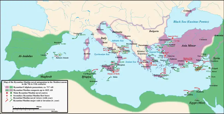 The Byzantine navy briefly won back Alexandria in 645, but lost it again in 646 shortly after the Battle of Nikiou.[31] The Islamic forces raided Sicily in 652, while Cyprus and Crete were captured in 653.