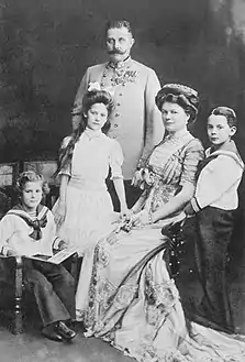 Archduke Franz Ferdinand with his wife Sophie, Duchess of Hohenberg, and their three children (from left), Prince Ernst von Hohenberg, Princess Sophie, and Maximilian, Duke of Hohenberg, in 1910