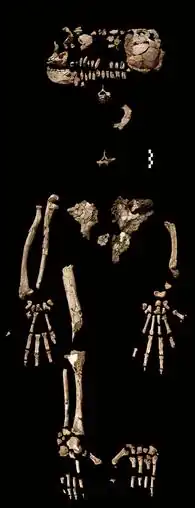 Ardi (ARA-VP-6/500) is the designation of the fossilized skeletal remains of an Ardipithecus ramidus, thought to be an early human-like female anthropoid 4.4 million years old. It is the most complete early hominid specimen, with most of the skull, teeth, pelvis, hands and feet,[1] more complete than the previously known Australopithecus afarensis specimen called "Lucy." In all, 125 different pieces of fossilized bone were found.[2]