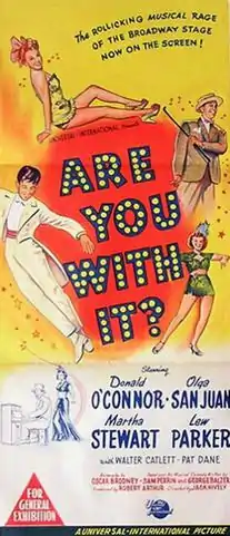 Are You with It? is a 1948 American musical comedy film directed by Jack Hively. The plot is about a young insurance man who quits his job to join a traveling carnival.[1] The film is based on the 1945 Broadway musical of the same name and the 1941 novel Slightly Perfect by George Malcolm-Smith. The film stars Donald O'Connor, Olga San Juan, Martha Stewart and Lew Parker. Parker reprised his role from the musical.