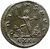 - ↑ Later emperors Tacitus and Carus would mint coins with the legends XI or IA, signalling a 10% of silver in the alloy.