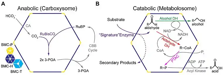 In addition to the anabolic carboxysomes, several catabolic BMCs have been characterized that participate in the heterotrophic metabolism via short-chain aldehydes; they are collectively termed metabolosomes.[6][23][12]