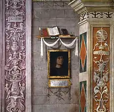 The right part of the fresco shows a window with a grid; on the left is a shelf with books and an amphora: under it is a self-portrait of Pinturicchio, featuring the dedicatory bejewelled inscription, "BERNARDINVS PICTORICIVS PERVSIN[VS]".