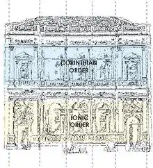 The intricate, dual-level façade is in the Renaissance Revival style. The lower level of the façade consists of capped columns in the Ionic order with fluted scamozzi capitals. These lower columns sit upon carved stone pedestals held in place by rusticated blue-stone plinths. On the upper level of the façade fluted Corinthian columns are crowned with an ornate entablature. The upper frieze is decorated with nude figures holding flowers and fruits, while the lower half contains ornamented wreaths carved in place by sculptor Charles Summers.[4]