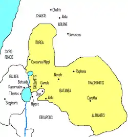 In the 1st century BCE the land was acquired by Herod the Great. He established a Jewish community there of Jews from Babylon who were brought to Batanaea for the purpose of maintaining order against the banditry of the Trachonites.[3] This underlines the much more eastern Location at the borderline to the Nabatean supported Desert Robbers.[4] Upon Herod's death in 4 BCE, Batanaea passed to his son Philip as part of his inheritance. In some sources Philip is referred to as "Tetrarch of Batanea" with the capital at Caesarea Philippi, though his lands were more extensive than this.