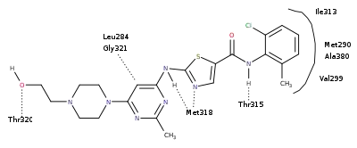 Dasatinib has some structural elements in common with nilotinib, in particular the juxtaposition of the aminopyrimidine and the carboxamide groups. The aminothiazole segment of dasatinib makes a bi-dentate H-bonding interaction with the backbone CO and NH of Met-318 and the amide-NH makes an H-bond with the side chain oxygen of Thr-315.[11]