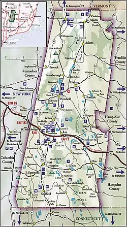 Berkshire County (pronounced /ˈbɜːrkʃər/) is the westernmost county in the U.S. state of Massachusetts. As of the 2020 census, the population was 129,026.[2] Its largest city and traditional county seat is Pittsfield.[3] The county was founded in 1761.[4] The Berkshire Hills are centered on Berkshire County. Residents are known as Berkshirites. It exists today only as a historical geographic region, and has no county government, with the exception of the retirement board for former county workers, and certain offices such as the sheriff and registry of deeds.