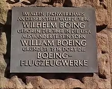 William Boeing was born in Detroit, Michigan, to Marie M. Ortmann, from Vienna, Austria, and Wilhelm Böing (1846–1890) from Hohenlimburg, Germany.[1] Wilhelm Böing emigrated to the United States in 1868 and initially worked as a laborer.[2] His move to the United States was disliked by his father and he received no financial support. He later made a fortune from North Woods timber lands and iron ore mineral rights on the Mesabi Range of Minnesota, north of Lake Superior.[1]