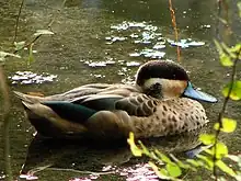 The blue-billed teal, spotted teal or Hottentot teal (Spatula hottentota) is a species of dabbling duck of the genus Spatula. It is migratory resident in eastern and southern Africa, from Sudan and Ethiopia west to Niger and Nigeria and south to South Africa and Namibia.[1][2] In west Africa and Madagascar it is sedentary.