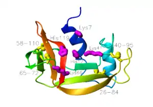 Bovine pancreatic ribonuclease, also often referred to as bovine pancreatic ribonuclease A or simply RNase A, is a pancreatic ribonuclease enzyme that cleaves single-stranded RNA. Bovine pancreatic ribonuclease is one of the classic model systems of protein science.[1] Two Nobel Prizes in Chemistry have been awarded in recognition of work on bovine pancreatic ribonuclease: in 1972, the Prize was awarded to Christian Anfinsen for his work on protein folding and to Stanford Moore and William Stein for their work on the relationship between the protein's structure and its chemical mechanism;[2] in 1984, the Prize was awarded to Robert Bruce Merrifield for development of chemical synthesis of proteins.[3]