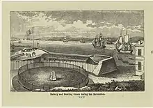 The park was described in 1926 as having "walks, benches, sumac trees and poorly-kept [sic] lawns", as well as a fountain in the center used by local children to cool off in the summer.[18] It suffered neglect after World War II. Starting in 1972, the city renovated Bowling Green to restore its 17th-century character.[19] In conjunction with the park's renovation, the Bowling Green subway station underneath the park was expanded, necessitating the temporary excavation of the park.[20] The renovation faced a lack of funds during the 1975 New York City fiscal crisis[21] but was completed in the late 1970s.[22]