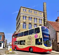 As of August 2016 the fleet consists of 326 buses and coaches.[26] The company mainly uses East Lancs OmniDekkas, Wright Eclipse Gemini 2 bodied Volvo B9TLs, and Wright StreetDecks.[27] In October 2019 the company received 30 Alexander Dennis Enviro400ER hybrid electric buses for use on Route 5, which are geofenced to be used in electric mode within Brighton and Hove's ULEZ (Ultra Low Emission Zone).[28]