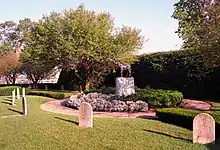 Grave of Bull Lea at Calumet Farm, surrounded by the graves of racehorses he sired; those of Hill Gail and Iron Liege are visible in the foreground.