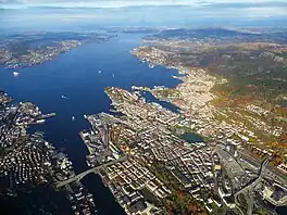 Byfjorden (Norwegian Nynorsk and Bokmål: /byːfjɔrn/, /-ɔɾn/; Bokmål: also /-ɔɳ/; Bergensk: usually /-ɔʁn/) is a fjord in Vestland county, Norway. The 15-kilometre (9.3 mi) long fjord separates the island of Askøy from the mainland Bergen Peninsula, passing right north of the city of Bergen on the mainland. The western entrance to Byfjorden is between the village of Drotningsvik in Laksevåg borough, Bergen, and the village of Marikoven on the island of Askøy in Askøy municipality. The northern entrance to the fjord is between the village of Ask on Askøy and Mjølkeråen in the borough of Åsane in Bergen. On the northern end, it connects with the Salhusfjorden and Herdlefjorden.[1] There is one road crossing over the Byfjorden: the Askøy Bridge, which crosses near the western end of the fjord. The name literally means city-fjord, and it is so named because of its importance as a transportation route into and out of the city of Bergen.[2]