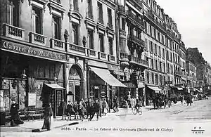 The Cabaret des Quat'z'Arts was founded in December 1893 by François Trombert on the site of the old Café du Tambourin.[2] He named the establishment after the second annual Bal des Quat'z'Arts, an event of the École des Beaux-Arts.[3] That costume ball was held 9 February 1893 at the Moulin Rouge and, along with merriment and drinking, included nude models as living paintings, a nude woman standing on a table at midnight,[2][4] and a subsequent lawsuit.[5] The term "Quat'z'Arts" referred to the school's four disciplines (architecture, painting, printmaking, and sculpture).[1] Theatrical offerings were performed by the cabaret's troupe or by marionettes and included satirical revues and shadow plays.[6] Venues similar to Chat Noir were La Lune Rousse and Les Pantins.[7] After Trombert's death (1908), Martial Boyer took over as director; subsequent editors were Gabriel Montoya and Vincent Hyspa.