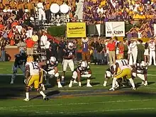 On October 23, Newton led Auburn to a 24–17 victory over the LSU Tigers. He rushed for a season-high 217 yards in the game, giving him 1,077 yards for the season, and set the SEC record for yards rushing in a season by a quarterback—a record previously held by Auburn quarterback Jimmy Sidle that had stood for over 40 years.[44] After this game, Newton became just the second quarterback to rush for over 1,000 yards in the conference's history.[45] He also broke Pat Sullivan's school record for most touchdowns in a single season, a record that had stood since 1971, with 27.[46] Both of these records were broken on the same play: a 49-yard touchdown run in which Newton escaped two tackles, corrected himself with his arm, eluded two additional tackles, and dragged a defender into the endzone for the touchdown. The play was described as Newton's "Heisman moment".[47][48][49] Auburn received its first No. 1 overall BCS ranking, and Newton was listed as the overall favorite for the Heisman.[50] In the following game against Ole Miss, Newton scored on a 20-yard receiving touchdown on a pass from Kodi Burns on a trick play.[51]