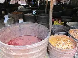 Mam is prepared by adding a mixture of salt, roasted red sticky rice and palm sugar to snakehead fillets and fermenting them for more than a year. The palm sugar and rice give mam an earthier and sweeter flavour and a reddish tone.[60][61] Prahok, on the other hand, can either be made from small fish with all the bones and less salt (called prahok chhoeung) or large deboned fish and more salt (called prahok sach (ប្រហុកសាច់, prâhŏk săch)),[19] which in turn can be made from larger fish (such as the striped snakehead (ត្រីរ៉ស់)) or smaller fish (such as trei kamplienh), with or without roe. Roe can be removed from the fish, cleaned, drained, and fermented separately.[60] Kapi is made by pounding cleaned, dried and salted shrimp into a homogeneous paste, sun-drying it for one day, pounding the paste again, sun-drying it for two more days and pounding the paste for the final time to attain a viscous consistency.[62]