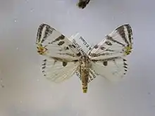 Adults have white wings with a series of dark grey stripes and spots, and the pale yellow forewing tornus.[2]