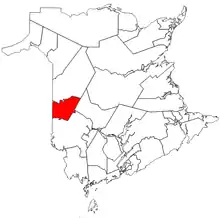 The riding of Carleton (as it exists from 2014) in relation to other New Brunswick electoral districts.