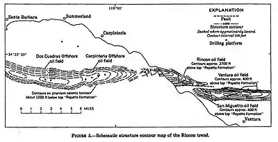 The Carpinteria Offshore Oil Field is an oil and gas field in Santa Barbara Channel, south of the city of Carpinteria in southern California in the United States. Discovered in 1964, and reaching peak production in 1969, it has produced over 106 million barrels of oil in its lifetime, and retains approximately 2 million barrels in reserve recoverable with present technology, according to the California State Department of Natural Resources.[1] Currently the field is produced from three drilling platforms four to five miles (8 km) offshore, within Federal waters outside of the tidelands zone. Two of the platforms are operated by Pacific Operators Offshore LLC (PACOPS), the operating arm of Carpinteria-based Carone Petroleum; the other platform is operated by Dos Cuadras Offshore Resources (DCOR). The Carpinteria field is the 50th largest field in California by total original oil in place, as of the end of 2008.[1]
